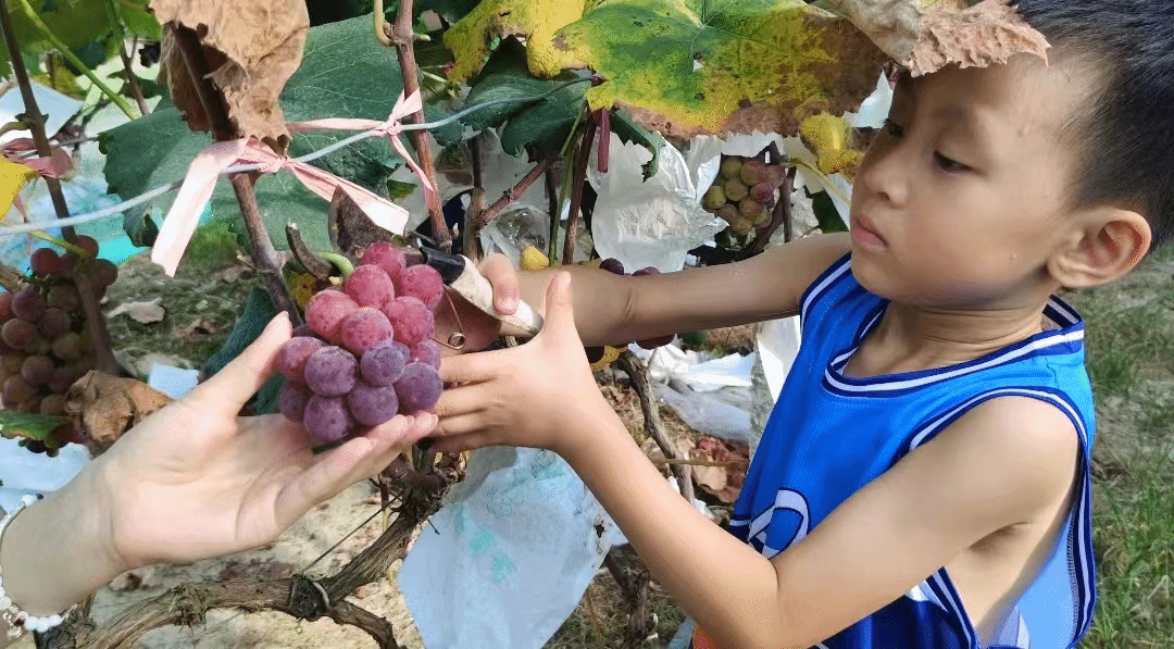 在这户贫困家庭的小院里,不大的葡萄棚里挂满了沉甸甸的果实。葡萄棚旁,一座简朴却整洁的房屋在阳光下显得格外温馨,活动当天,志愿者们与邹松岳一家热情交流,老人家脸上洋溢着淳朴的笑容,对志愿者的到来表示了由衷的欢迎和感激。在他们的带领下,志愿者们拿起剪刀,钻进棚中,采摘希望的果实,孩子天真无邪的笑声在小棚子里回荡,为这次活动增添了几分温馨与欢乐。