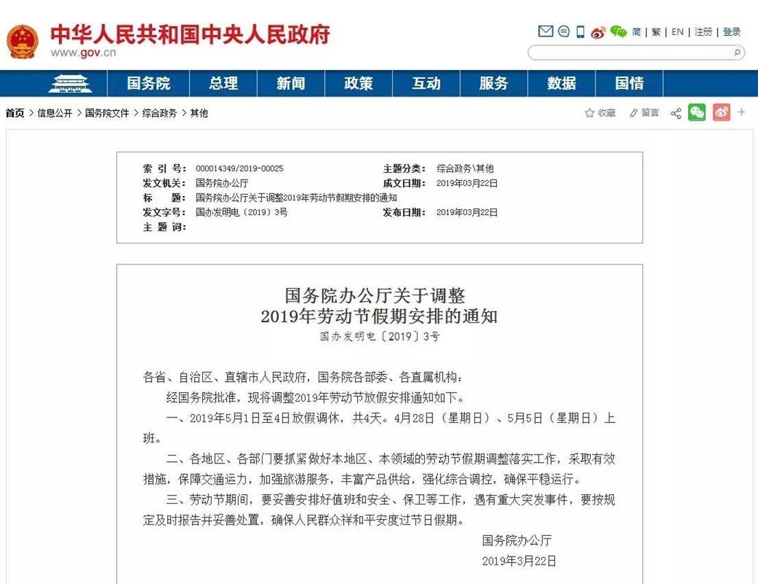 刚刚,国务院办公厅发布关于调整2019年劳动节假期安排的通知。