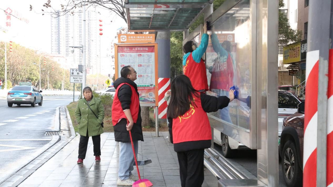 清晨,迎着朝阳一群“红马甲”相聚在校图书馆前坪,来自14个二级学院的60余名青年志愿者准备体验“雷锋”的一天。他们拿上清洁工具,分组行动来到氐星路、新星南路和学院路共5个公交站台擦亮了这座城市的“窗口”。现场,同学们分工协作,认真擦拭公交站台的玻璃、座椅,清扫周边地面垃圾,仔细清理卫生死角。他们用实际行动传承和践行雷锋精神,也以青春的活力和饱满的热情,引来无数路人驻足夸赞,这群印着beat365中文官方网站名片的“红马甲”成为了今天娄底市区的一道亮丽风景线。