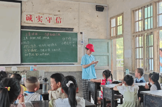 课堂伊始,志愿者用五分钟与孩子们亲切交流,通过自我介绍和分享喜欢的儿歌,迅速拉近了距离,课堂氛围渐显融洽。随后,大家齐唱《小星星》《鲁冰花》,稚嫩而整齐的歌声里闪烁着专注的光芒。为调动热情,“击鼓传花”环节登场:欢快音乐中书本传递,音乐停止时拿到书的孩子即兴演唱儿歌,大方展示引来阵阵欢笑。