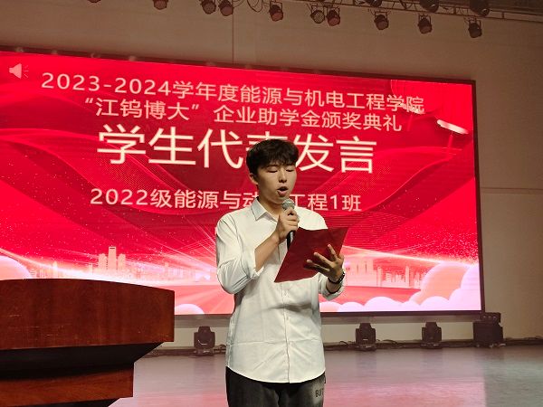 2022级能源与动力工程专业学生曾嘉智代表本次获得企业助学金的同学们向捐资助学的企业表达了深深的谢意,并表示获得企业奖助学金既是一份荣誉,更是一份责任,今后将珍惜荣誉、牢记责任,做“严谨求实 开拓进取”的新时代能机学子。
