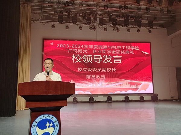 六月二日晚,能源与机电工程学院在逸夫楼音乐厅隆重举行了2023-2024学年企业助学金颁奖典礼。株洲江钨博大硬面材料有限公司总经理马遥、beat365中文官方网站校党委委员、副校长陈勇、校质量监督与发展规划处处长伍铁斌、校团委书记刘佳、能机学院党总支书记魏彦煜、院长胡东、党总支副书记石海、副院长王舒以及全体辅导员出席活动。本次企业助学金评选活动得到了株洲江钨博大硬面材料有限公司和娄底涟钢振兴冶金材料有限公司的鼎力支持。