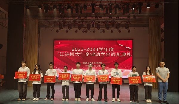 颁奖典礼上,陈勇首先为株洲江钨博大硬面材料有限公司颁发锦旗。随后,石海宣读了2023-2024学年能源与机电工程学院企业助学金表彰文件,马遥、陈勇、魏彦煜、胡东为获得资助的30名品学兼优的贫困学生颁奖并与他们亲切交流。