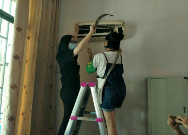 (志愿者在明德楼教室办公室内清洗空调)