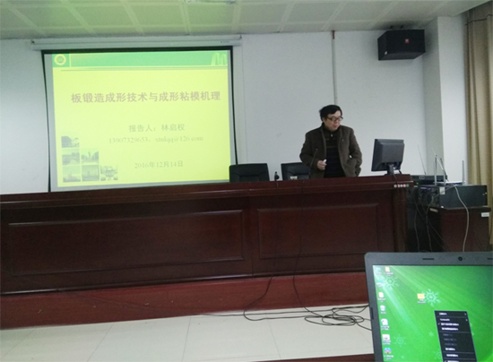 林启权教授从板锻造背景及意义、实心凸起的拉深-镦挤板锻造成形、空心凸起的镦粗-翻边板锻造成形、粘模行为研究背景及意义、高强钢板冲压宏观粘模行为和纳观粘模行为初步探索等六个方面进行了深度讲解,展示了研究团队部分先进的科研成果,并与在座师生交流了科研体会及技术难题。