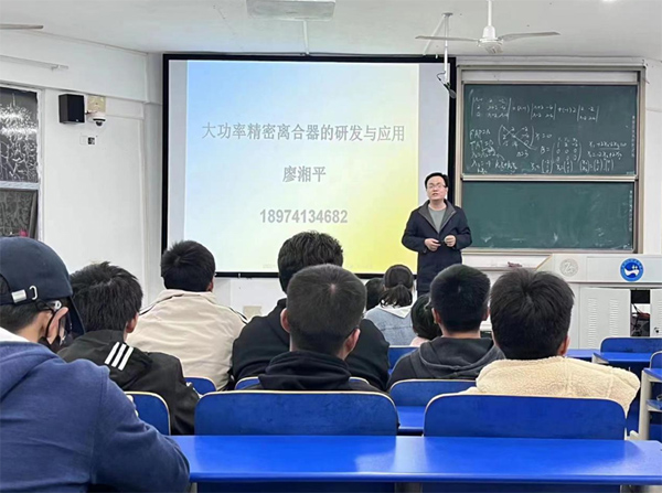 2022年11月16日晚,能源与机电工程学院举办大功率离合器技术方面的学术讲座,廖湘平博士做了题为《大功率精密离合器的研发与应用》的学术报告。讲座由机械设计制造及其自动化教研室主任林鹏博士主持,机械专业2022级全体学生及部分教师代表聆听了讲座。