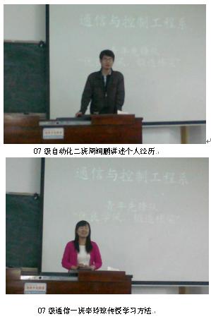 两位获得过“国家奖学金”、“国家励志奖学金”的07级学生周润鹏、李玲琼就自己的职业规划、个人经历和学习方法向大家做了经验介绍,他俩所说的“大学其实不是用来享受的,上课和有计划的生活才是最重要的”精彩言语赢得了同学们的称赞。全体先锋队成员还集体观看了哈佛大学、耶鲁大学等著名高校学生生活和学习的视频。