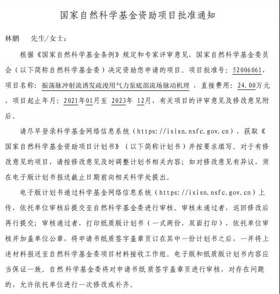 近年来,学校围绕一流学科建设、交叉学科协同创新和“三全育人”工作,打造了以水射流团队为代表的一批科研创新群体。此次林鹏博士获批国家自然科学基金,是学校长期注重学科发展和创新团队建设所取得的重要成果,必将进一步提升beat365的科研水平和综合实力。(文:邓岭)