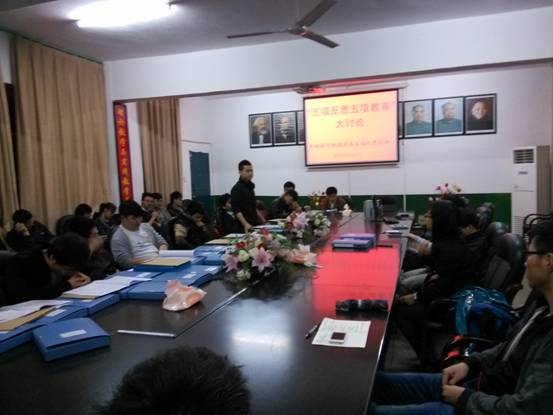 2014年4月21日晚7点30分,机电工程系机械设计制造及其自动化党支部全体党员在若谷楼205会议室举行党的群众路线教育实践活动“五项教育、五项反思”讨论会及学习《习近平在兰考调研指导群众路线教育实践活动时的讲话》。会议由机械设计制造及其自动化党支部书记宋双老师主持。会上,宋老师带领全体党员认真学习了《习近平在兰考调研指导群众路线教育实践活动时的讲话》、《五项教育、五项反思》等相关文件和精神;并围绕此次学习进行讨论和发言,结合工作实际谈了几点体会:一是认真学习五项教育和五项反思,不断提高自己的党性意识;二是必须对照自身的不足反思自己,重新塑造良好个人形象;三是结合自己的工作实际,不断改进工作作风和提高工作实效。随后,其他学生党员同志都结合各自的情况,围绕《五项教育、五项反思》的内容先后发言,会议达到了预期的效果。(宋双供稿)