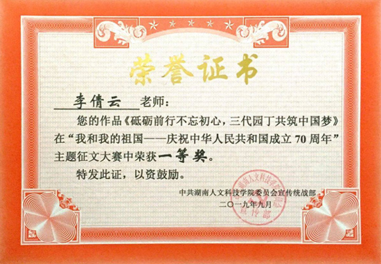 2019年9月,为庆祝中华人民共和国成立70周年,弘扬爱国主义精神,beat365中文官方网站面向全校师生开展“我和我的祖国——庆祝中华人民共和国成立70周年”主题征文大赛。大赛共征文53篇,按教师组、学生组分开评奖。经过专家组的精心评选,能源与机电工程学院机械设计制造及其自动化青年教师李倩云的《砥砺前行不忘初心,三代园丁共筑中国梦》作品荣获教师组一等奖。