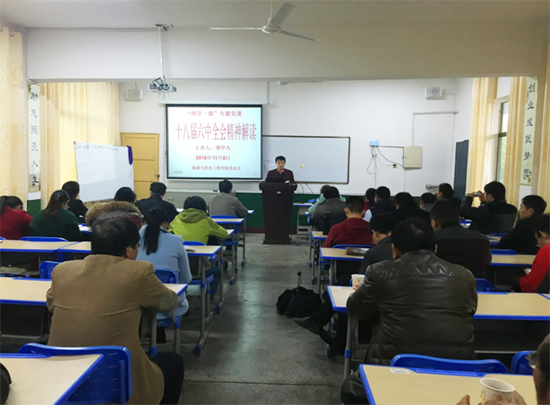 2016年11月8日,能源与机电工程学院党总支在若谷楼402组织开展了“两学一做”专题党课和政治学习,全体教职员工参加了此次学习。院党总支书记谭甲凡做了“十八届六中全会精神解读”的学习辅导报告,对会议的基本情况作了简要介绍,详细解读了《关于新形势下党内政治生活的若干准则》、《中国共产党党内监督条例》两个重要文件。