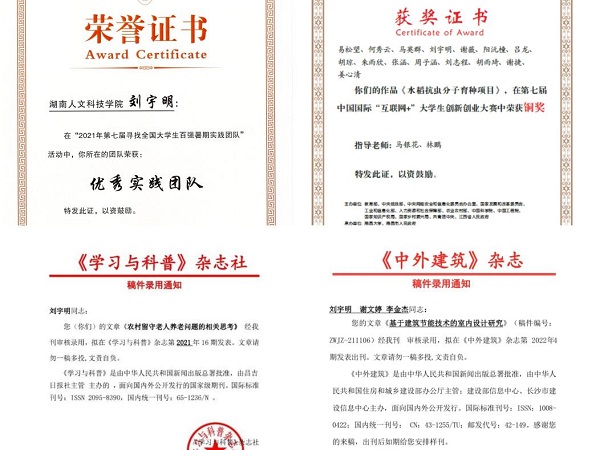 涓滴之水终可磨损大石,不是由于它的力量强大,而是在于昼夜不舍的滴坠。散系之沙能堆成巍巍高塔,在于积少成多的拢聚。博观约取,厚积薄发,方能汇成一片灿烂星空。不断的知识积累让她在多个舞台上绽放自己的光芒。2021年她在大中专学生志愿者暑期文化科技卫生“三下乡”社会实践活动中表现突出,撰写的多篇新闻稿被中青网、中国基层网等多个国家级、省级新闻媒体转载,被评选为省级优秀个人;同年在湖南省消费帮扶营销大赛中获得季军的优秀名次;2022年6月,她参与的大学生创新创业训练计划项目《上团红色之旅APP——寻红军足迹 励今日长征》校级立项并被推荐参与省级立项评审项目,获得“创新创业奖学金”创业类团体奖。