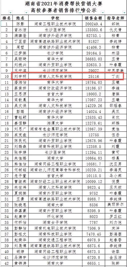 近日,湖南省2021年消费帮扶营销大赛高校参赛者排行榜公布,我院学子刘宇明,经过激烈的比拼,最终在数千名参赛选手中脱颖而出,以25116元的销售金额,勇夺本届大赛季军(全省第10名),展现了我院学子高超的营销技能水平和优良素质。