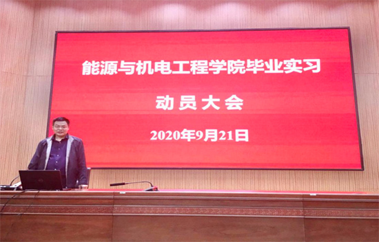 9月21日上午,能源与机电工程学院2017级学生毕业实习动员大会在匠成楼报告厅召开,教务处处长羊四清、学院党政领导、实习带队老师、2017级各班班主任、企业代表以及2017级全体学生参加了此次会议。会议由院长谢常清主持。