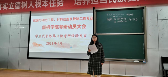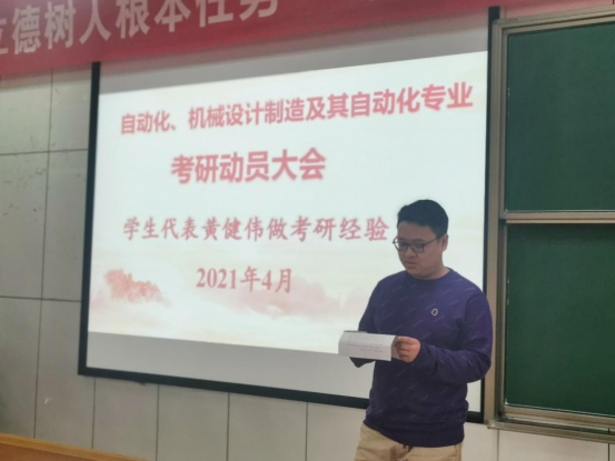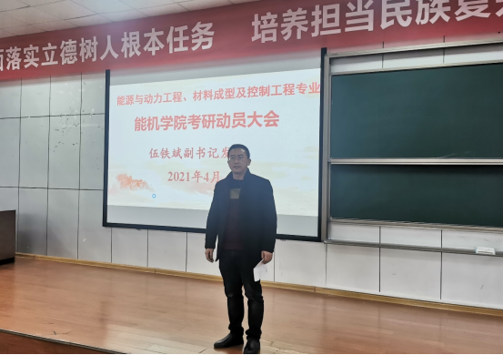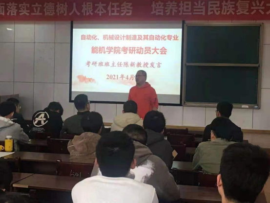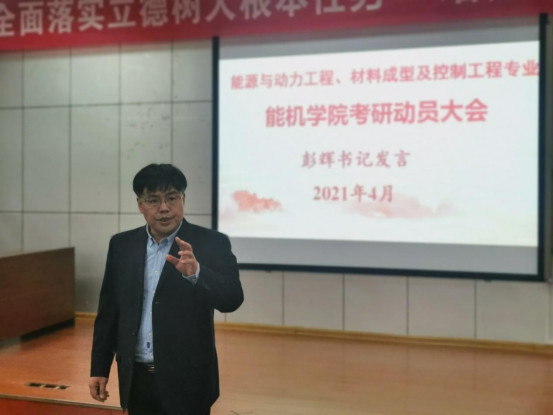 能源与机电工程学院坚持党建引领,构建了具有工科特色的“三全育人”体系,牢固树立了一切为了学生、为了学生一切、为了一切学生的教育理念。为更好地调动我院学生考研积极性,帮助学生确立考研目标,增强学生考研信心,坚定学生考研决心, 4月9日下午,学院在同德楼601教室分专业召开了2018级学生考研动员大会,院党总支书记彭辉、院党总支副书记伍铁斌教授、考研班班主任陈新教授、院学工办主任邓景文老师、2018级考研学生共196人和2017级考取研究生的学生代表参加大会。