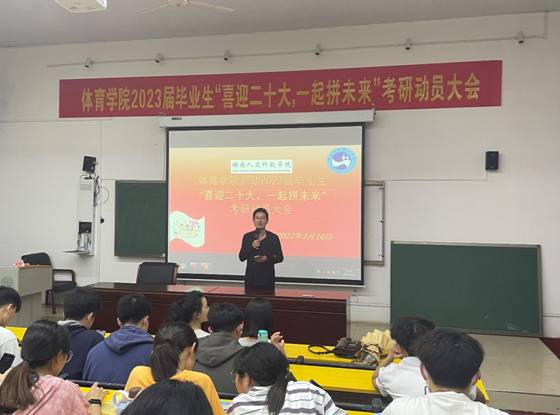 与就业形势日趋严峻。为引导我院学生树立考研自信心,了解当下考研形势,帮助同学们明确考研目标,增强同学们不忘初心,敢于拼搏的勇气, 3月16日晚,体育学院在博达楼115教室启动“喜迎二十大,一起拼未来”考研动员大会。院长刘玉江,党总支副书记谢嘉,2023届毕业班主任应邀出席,2023届毕业生共计120人参加。会议由董植寿老师主持。