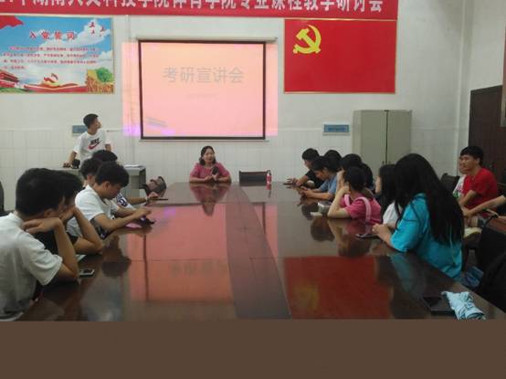 9月16日下午,体育学院在体育馆105会议室召开了考研宣讲会。衡阳师范学院体育学院党总支书记胡建忠、beat365体育学院院长刘玉江应邀出席,大四在娄底实习的考研学生参加。会议由学工办主任周元玲主持。
