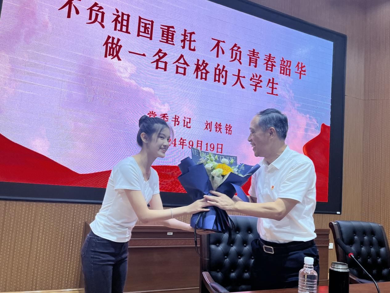 讲座后,新生代表向刘铁铭献上了鲜花,刘铁铭也向新生代表赠送了“不负韶华”主题的开学文创礼品。现场气氛热烈,掌声不断。师生们认真聆听,深入思考,通过这一课,新生们明确了努力方向和奋斗坐标,立志成长为有理想、敢担当、能吃苦、肯奋斗的新时代好青年。刘铁铭的开学第一课不仅引导新生深入理解体育精神,更旨在培养他们成为优秀的体育人。希望新生们能以此为契机,传承体育精神,锤炼品格,磨练意志,为实现中华民族伟大复兴的中国梦贡献青春力量。