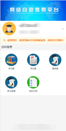 3、登录成功之后进入主页面,学生可以通过不同的缴费入口,缴纳自己需要缴费的项目。