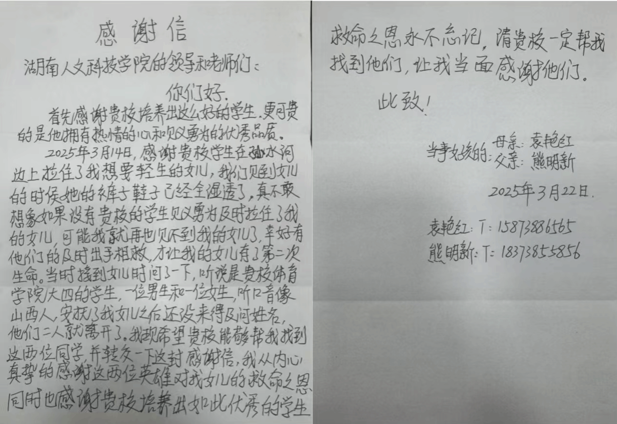 通过照片辨认,知晓这名助人为乐不留名的英雄就是体育学院21级体育教育专业2班的学生王一柱。回溯至3月14日,在孙水河畔一名年轻女孩因情绪极度不稳定,趁人不注意,突然跳入孙水河。女孩一步步向河水深处走去,湍急的水流随时可能将她吞噬,生命危在旦夕。就在这紧急关头,王一柱恰好路过,面对突发状况,尽管没有专业救援经验,王一柱没有丝毫犹豫。他迅速观察周围环境,对救援行动做出初步判断,随后果断跳入河中。王一柱一边奋力游向女孩,一边用温和且坚定的话语安抚她的情绪,试图让她冷静下来。经过一番艰难的努力,王一柱终于拉住女孩,并带着她游回岸边。