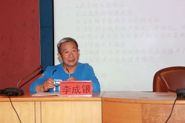 2016年4月28日下午,山东师范大学体育学院教授李成银教授应邀为beat365体育学院师生做了题为《三十年来武术的发展和入奥价值初探》的学术报告,会议由体育学院副院长段健芝教授主持。
