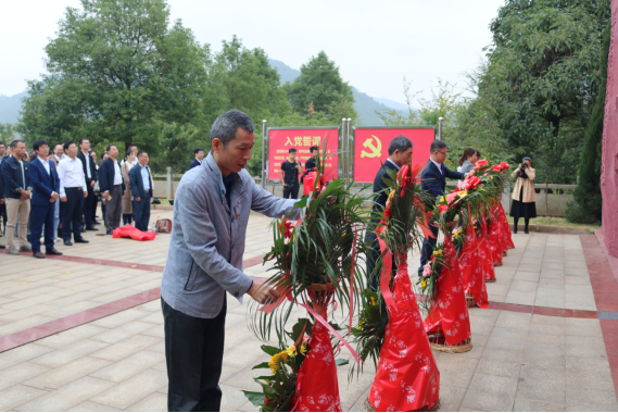 蒋毅书记仔细地整理花篮上的红色缎带