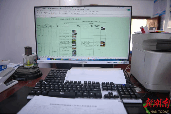 办公桌上,堆放着表格材料、计算器、订书机、蓝芩颗粒和矿泉水瓶;电脑页面上,是没来得及做完的毛田镇受灾人员紧急转移安置人口一览表和因灾倒塌损坏住房户台账。