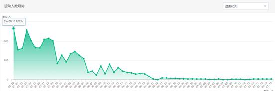 二:运动人数趋势(其中5.20:单日最高到2123人参与阳光跑,平均每日参与率:>30%)