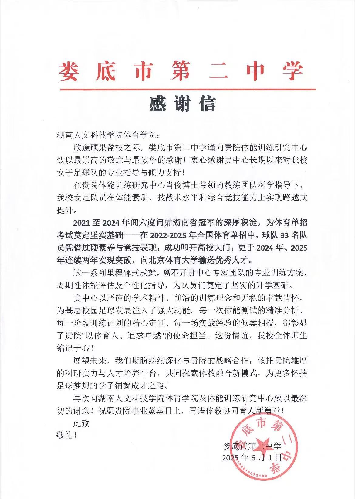 近日,娄底市第二中学发来感谢信,对我院体能训练研究中心长期指导该校女足、助力队伍取得竞技与升学双突破表示感谢。自2021年起,我院肖俊博士团队以“高校专家团队+基层运动队”模式,为娄底二中女足提供科学训练支持。