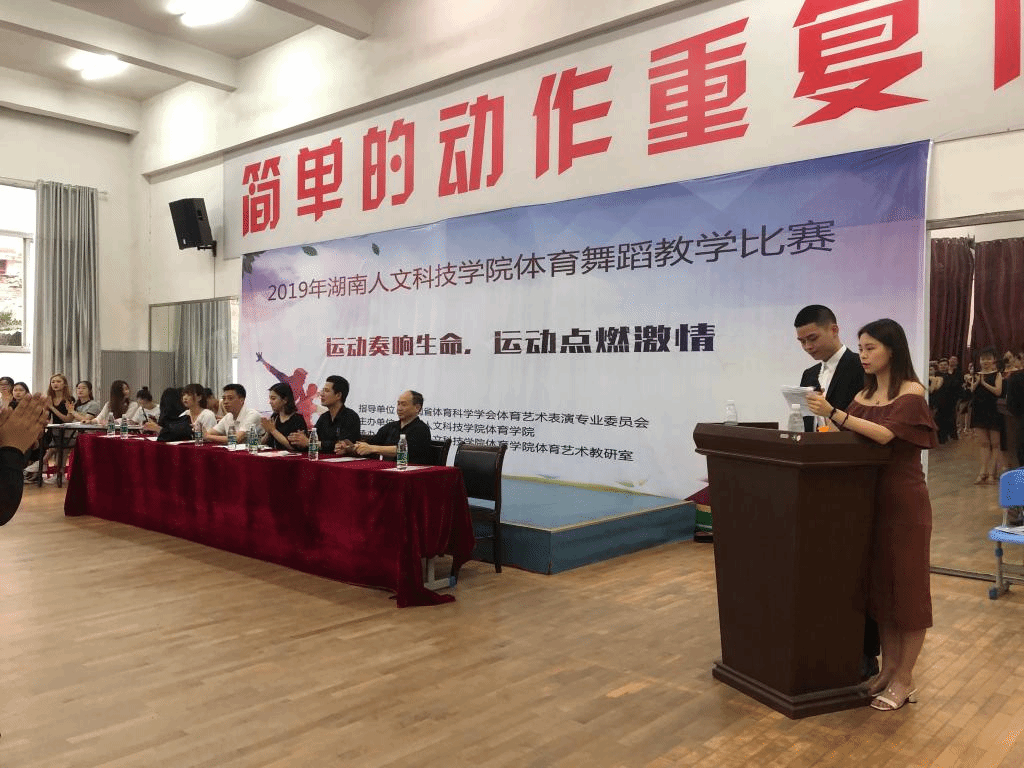 2019年beat365中文官方网站体育舞蹈教学比赛于6月17日在体育馆成功举办,该比赛由湖南省体育科学学会体育艺术表演专业委员会指导,beat365中文官方网站体育学院主办,beat365中文官方网站体育学院体育艺术教研室承办,体育学院副院长曾黎教授致开幕词。
