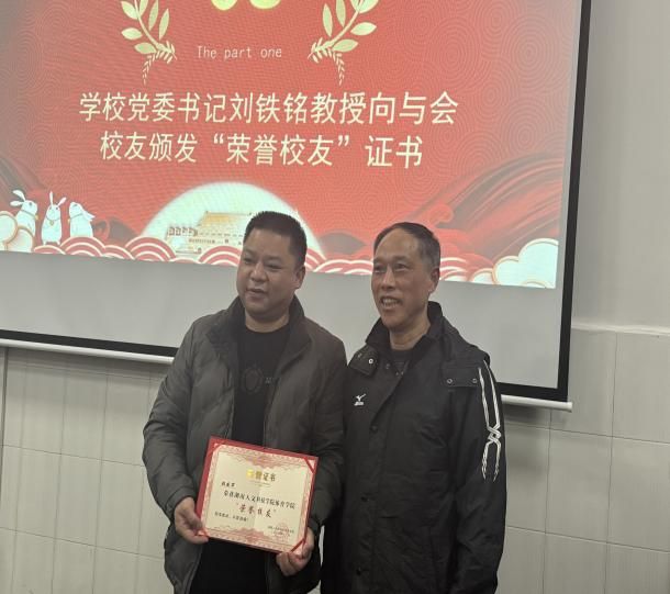 参观结束后,校友们齐聚学院体育馆103会议室,参加了一场别开生面的座谈会。会上,曾黎书记发表了致辞,对校友们的到来表示热烈欢迎。体育学院院长周惠新教授则详细介绍了学院的现状、发展情况及未来规划,让校友们对母校的发展有了进一步的了解。随后,校友们纷纷发言,分享了自己的学习、工作和生活经历,现场气氛热烈而温馨。在共谋体院发展的环节中,校友们积极出谋划策,为学院的发展提出了宝贵的建议和意见。在场的师弟师妹们还向校友们提出了问题,进行了深入的交流和探讨。刘铁铭书记对活动进行了总结发言,高度赞扬了体育学院校友在各方面取得的成绩,并号召广大校友要发挥自身优势为学院的发展贡献自己的力量。最后,刘铁铭一一为与会校友颁发体育学院“荣誉校友”证书。