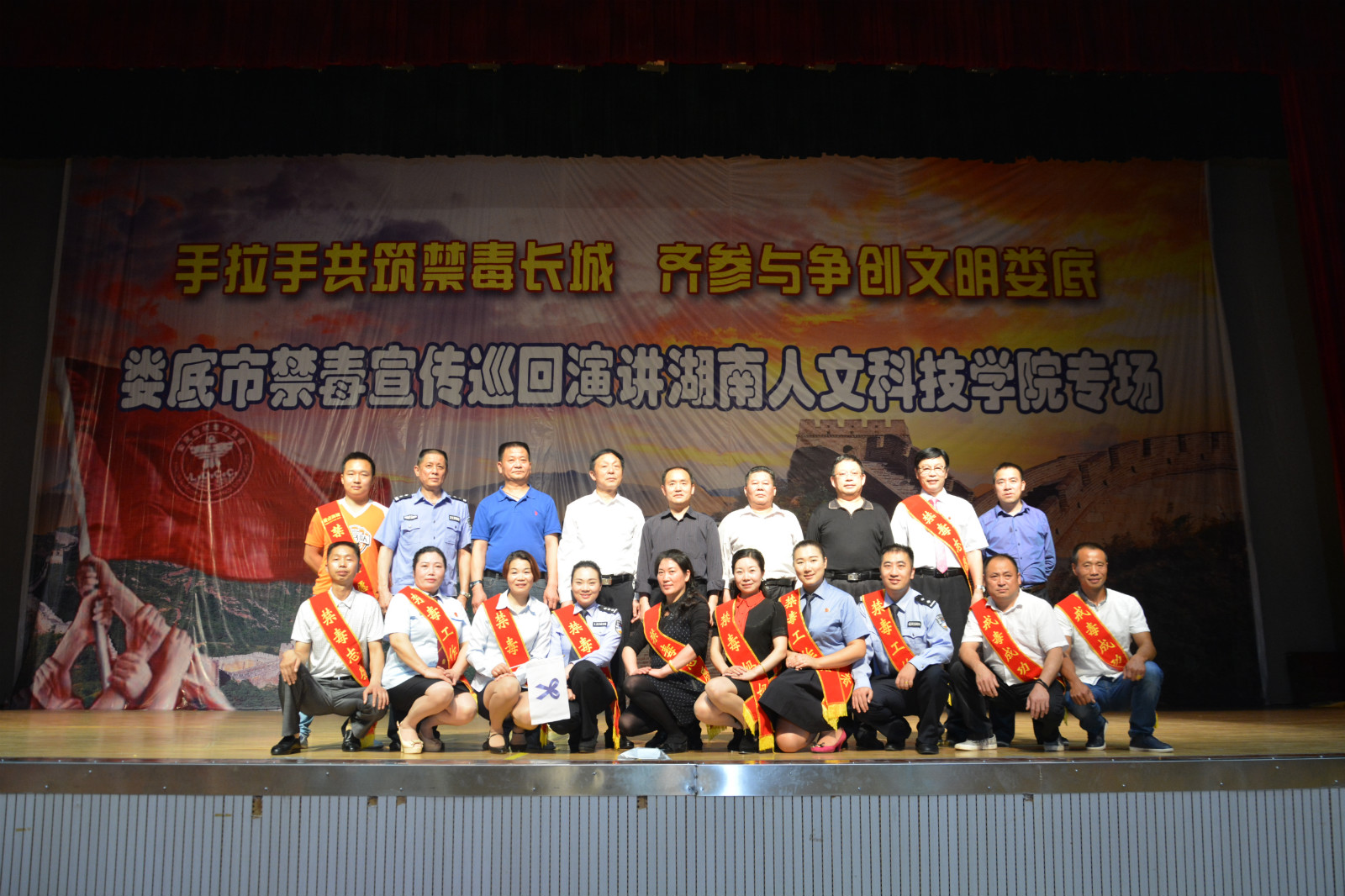 5月30日晚,由娄底市禁毒办、市禁毒协会、市慈善志愿者协会、市演讲艺术家协会联合组织的娄底市“手拉手共筑禁毒长城·齐参与争创文明娄底”禁毒宣传巡回演讲活动在beat365体育馆举行,号召全校师生向毒品宣战,向全社会呼吁“珍爱生命,拒绝毒品”。市禁毒协会会长肖新桃、市禁毒委副主任、禁毒办主任、beat365法制副校长朱青春、市禁毒委常务副主任、市禁毒支队支队长刘伟、市禁毒协会秘书长廖德民及beat365副校长刘铁峰出席活动。2015级全体学生及各学院分管学生工作副书记、全体辅导员、保卫学工全体干部职工4000余人聆听了演讲。
