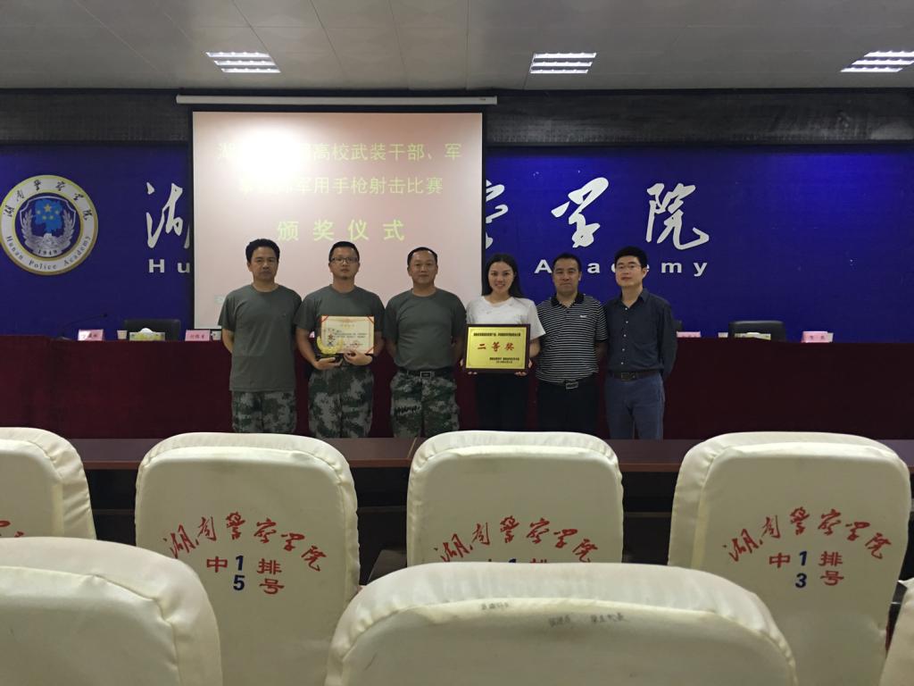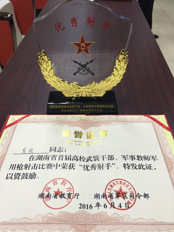 6月4日下午,湖南省首届武装干部、军事教师军用枪射击比赛在湖南警察学院落下帷幕。beat365参赛队员周樑、宁耐桥、肖俊、李盼强在比赛中奋力拼搏、沉着应战,取得了团体二等奖的好成绩,为学校赢得了荣誉。来自体育学院的兼职军事教师肖俊以92环获得“优秀射手”荣誉称号,并颁发了证书与奖杯。