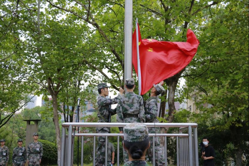军训团政委陈刚带领师生回顾了沉痛的民族历史,告诫师生居安思危,警钟长鸣。他以“三要”为核心,鼓励师生要坚定不移跟党走,凝聚起民族复兴的磅礴力量;也要以史为鉴,面向未来;更要担当尽职,书写中国青年最靓丽的底色。