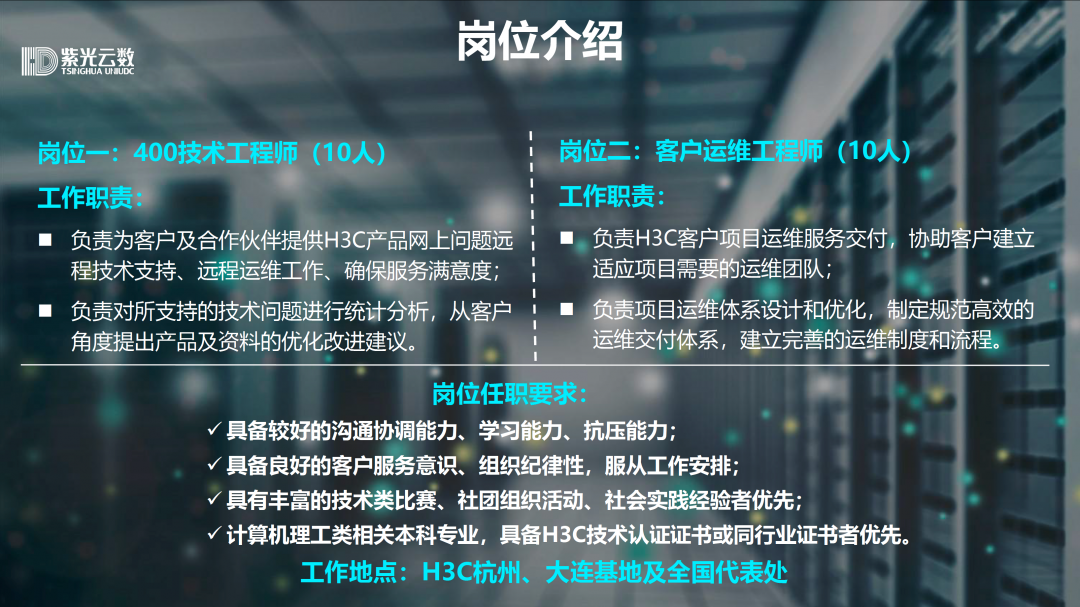 本次招聘宣讲会是由紫光云数科技有限公司面向全国15所高校网络工程一流专业开展的,拟招聘20位技术支持工程师外派新华三集团工作,其中包括H3C远程技术支持工程师10位、H3C客户运维工程师10位。