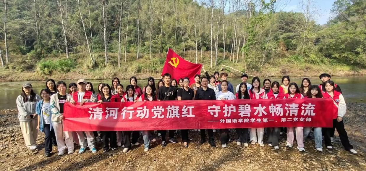 为全面深入学习贯彻党的二十大精神,深入贯彻落实、认真践行绿水青山就是金山银山的理念。2023年11月5日,外国语学院党总支书记阳立新、党总支副书记罗嗣安带领部分学生党员和入党积极分子前往孙水河附近开展“清河行动党旗红,守护碧水畅清流”主题实践活动。