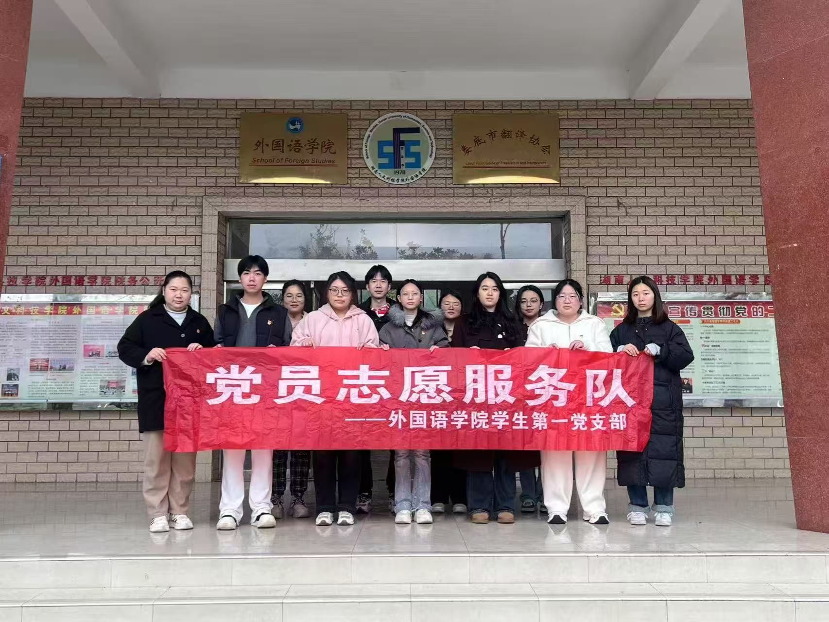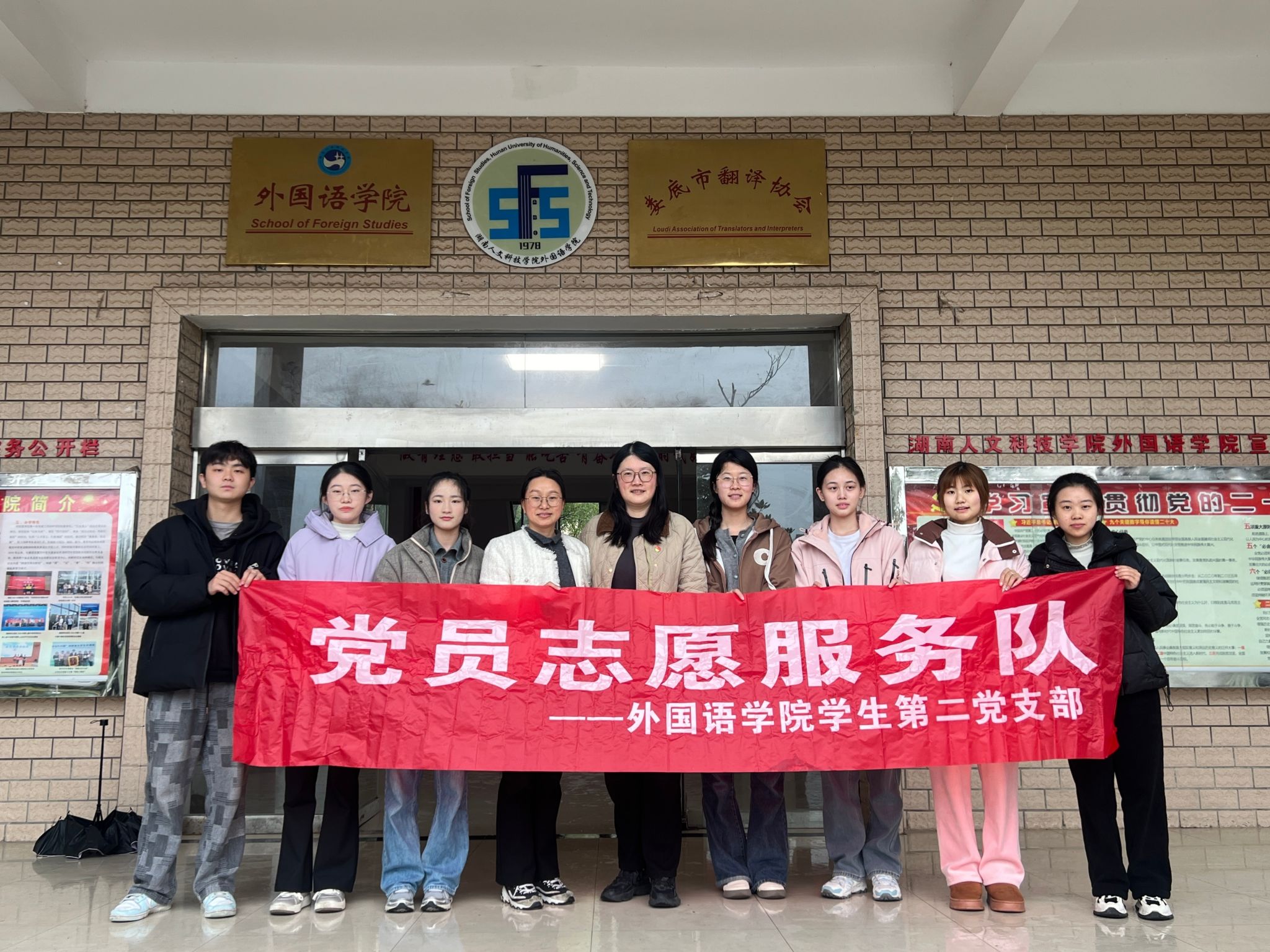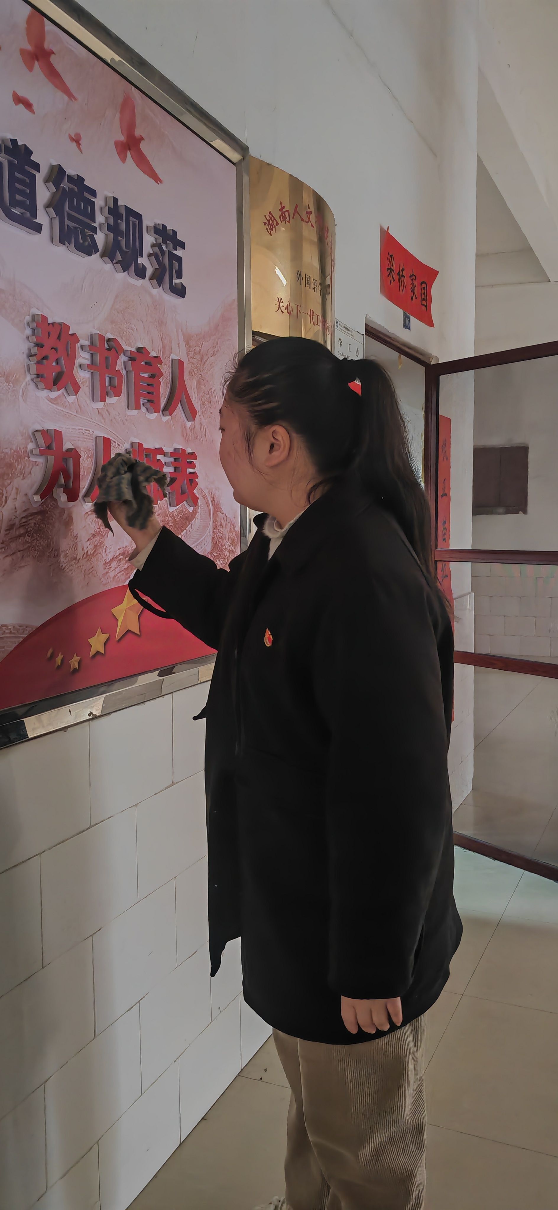 为迎接即将到来的本科教育教学审核评估,建设学院整洁有序环境,3月13日,外国语学院学生第一、第二党支部全体党员开展了“学生党员见行动 迎评促建树新风”主题党日活动。党总支副书记罗嗣安,学生第二党支部书记龙立平参加主题活动。全体学生党员积极响应,对播馨楼内宣传橱窗、文化长廊进行了全面清洁,以实际行动践行雷锋精神,为营造整洁优美的环境贡献力量。