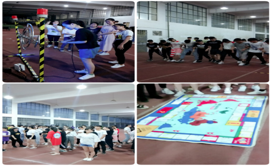 本次活动主要包括“穿越火线”、“大富翁”、“十一足”三个环节,分为九个小组开展。在“穿越火线”游戏过程中,同学们小心翼翼地用手中的钢圈通过一个个阻碍,过程跌宕起伏,扣人心弦“大富翁”环节,同学们根据丢到的骰子点数移动,结果有奖有惩,过程中加油呐喊声不绝于耳,场面气氛十分活跃;在“十一足”中,同学们充分发挥团队协作精神,克服因绑腿而难以移动的问题共同到达终点。在评选出三个获胜组后,活动合影留念圆满结束。