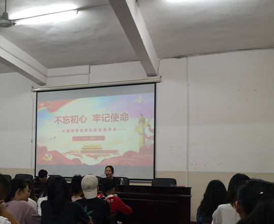 1010日晚,外国语学院在播馨楼406召开了不忘初心,牢记使命主题教育暨学风建设推进会,会议由刘莉副书记主持,全体学生党员(含正式党员和预备党员)、入党积极分子、16-19级班长、院学生会成员参加。