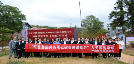 为了喜迎党的二十大胜利召开,提升党员思想意识、筑牢党员政治根基,beat365中文官方网站外国语学院党总支于10月8日前往娄底娄星区东冲村苍山居青少年教育实践基地开展入党宣誓活动。院总支委员、支部书记、辅导员及学生预备党员参加了此次活动。