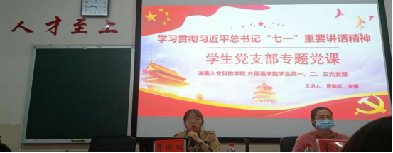 2021年10月26日,外国语学院学生党支部于播馨楼406开展了“学习贯彻习近平总书记‘七一’重要讲话精神”专题党课。学生党支部书记曹瑜虹、朱倩老师及外国语学院全体学生党员参加了此次党课。