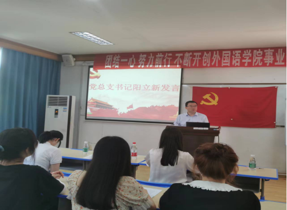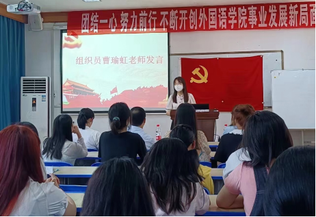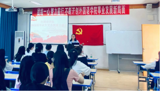 5月18日下午,外国语学院党总支在播馨楼301开展外国语学院2023届毕业生党员教育大会,外国语学院党总支书记阳立新、专职组织员曹瑜虹,学生支部书记朱倩与毕业生党员参与了此次大会。座谈会由学生支部书记龙立平主持。