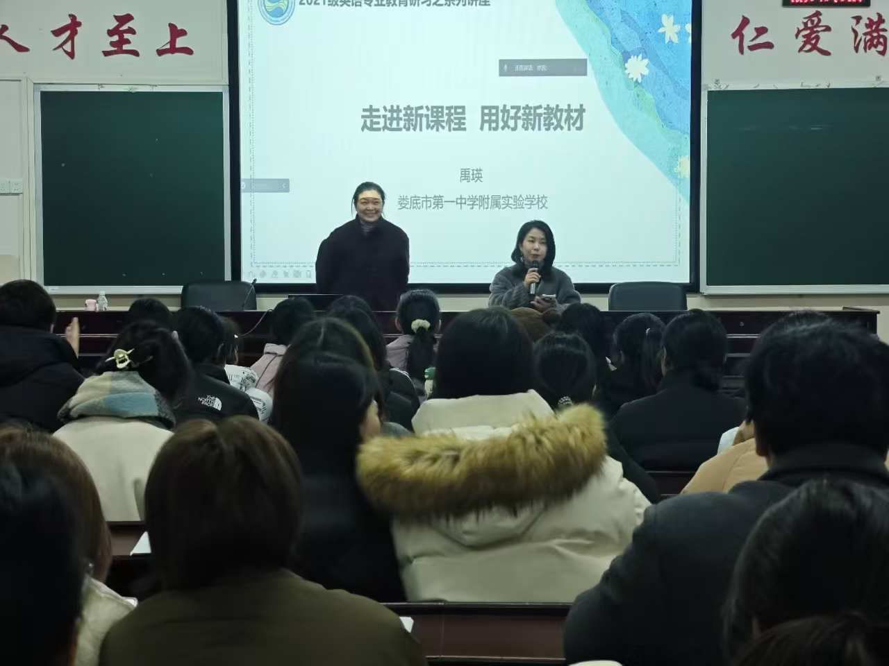 为了进一步巩固2021级英语师范专业教育实习的成果并了解和适应新教材的变化以胜任中学英语教育,2025年1月2日晚上,外国语学院邀请湖南省娄底市一中附属学校教导处主任禹瑛举行了主题为“走进新课程,用好新教材”的英语专业教育研习主题讲座,讲座由刘欣磊老师主持,英语专业2021级全体学生及教育研习指导老师线上线下同步参加此次讲座。