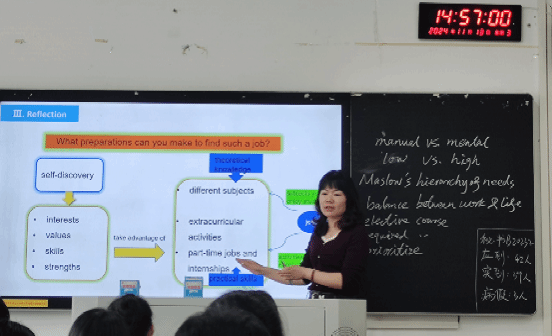 吴老师结合马斯洛需求层次理论组织学生就理性看待就业、积极面对就业、充分准备就业等方面展开积极讨论,引导学生树立正确就业观,成就人生价值。吴老师在教学中通过主题讨论、小组汇报等方式充分突出学生的主体地位,将教学内容与课程思政巧妙融合,深化了同学们对就业中实现“小我”与“大我”、“个人价值”与“社会价值”相统一的理解。整个课堂轻松活跃,同学们积极参与,讨论热烈,思政育人效果显著。