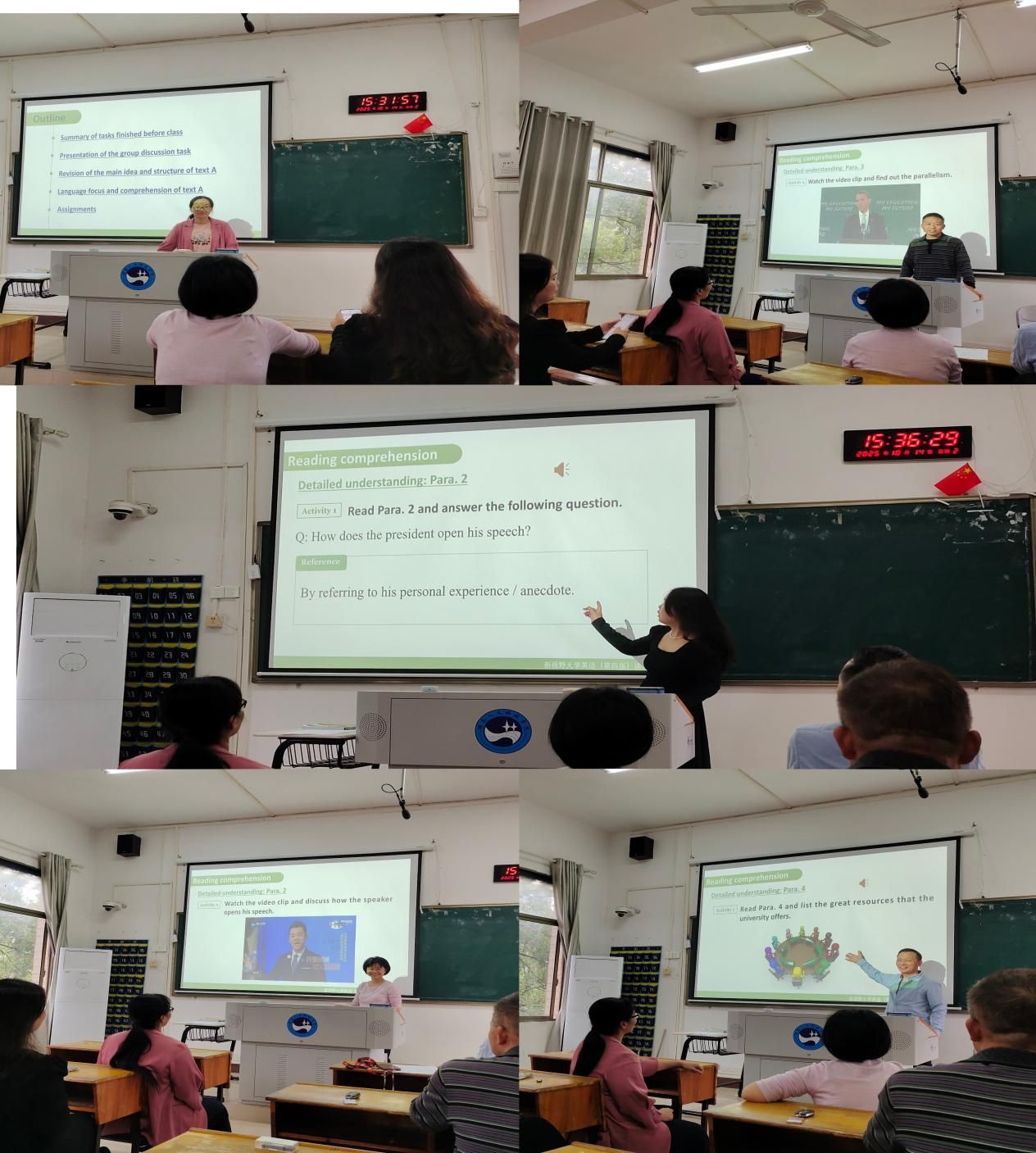 磨课活动在课程组长韦萍老师的组织下,围绕师范类专业学生英语核心素养培养目标展开,选取《新视野大学英语读写教程1》Unit one Toward a brighter future for all作为磨课案例。周建良、潘虹、曾琪、袁崛远、蒋旭东等教师代表依次围绕课程内容展开说课:从课前准备、课堂教学设计、教学方法、思政融入等多方面进行阐述。