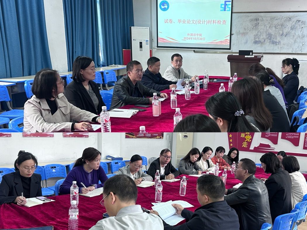 10月30日上午,外国语学院在播馨楼301迎来了由质量监控与发展规划处和教务处领导组建的本科教育教学审核评估专项小组。此次专项检查主要针对学院试卷、毕业论文(设计)等教学材料的自查自纠情况。