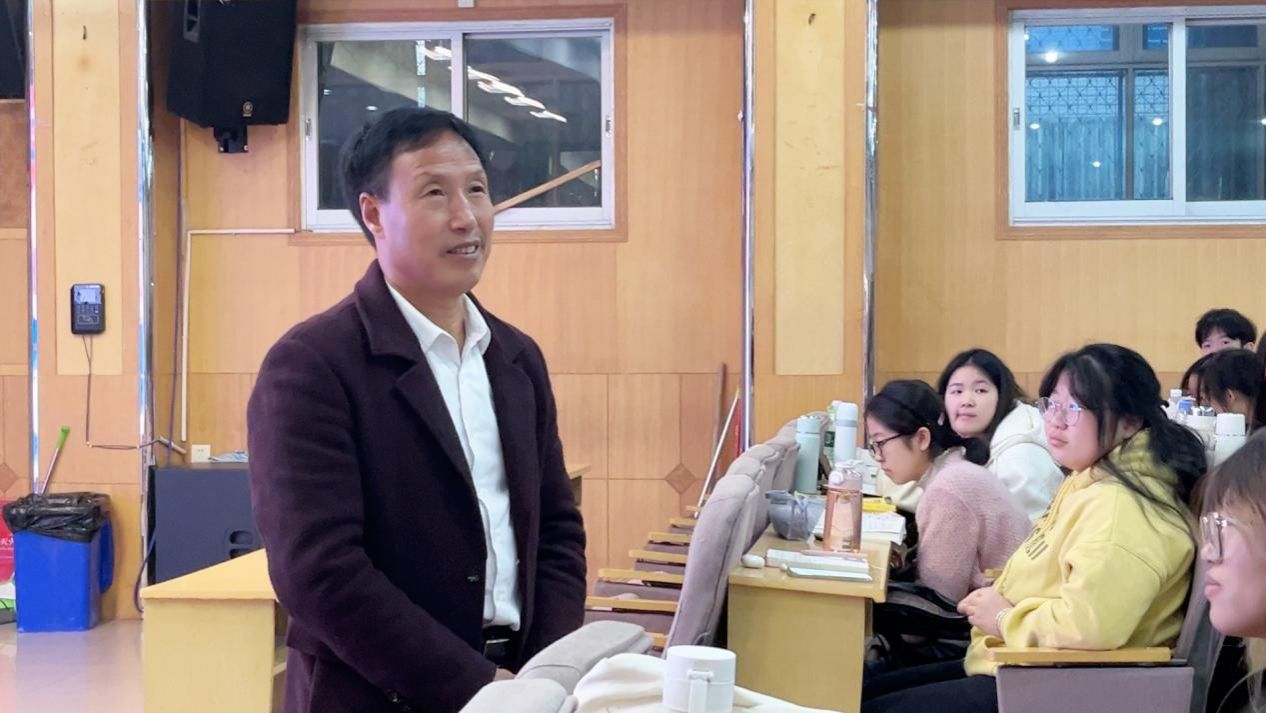 随后,奉光辉老师为同学们带来了一场以“边缘山区的师生情怀”为主题的精彩讲座。讲座一开始,奉老师播放了一段他被评为“最美乡村教师”的采访视频。视频展示了他近40年来扎根湖南省娄底市新化县奉家镇毛坪小学的经历。