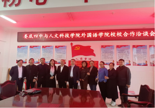 娄底市第四中学是我院省级英语师范生创新创业教育基地,为进一步推进基地建设,2021年10月14日,基地负责人胡瑾院长一行与娄底市第四中学校长周宇文等校领导在娄底市第四中学举行了基地建设工作推进会议。