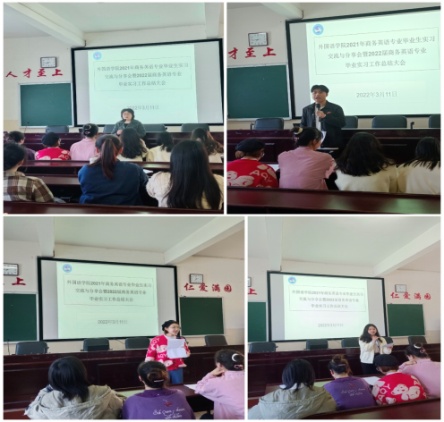 2022届商务英语专业实习工作于2022年1月结束,根据学院工作安排,实习经验交流暨实习总结会议于2022年3月11日在播馨楼406室拉开帷幕。2018级商务英语专业实习队的7名实习生代表和2019级商务英语专业所有学生参与了本次交流总结会。