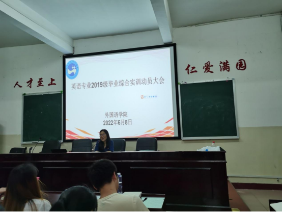 2022年6月8日晚,外国语学院在播馨楼406召开英语专业2019级毕业综合实训动员大会。外国语学院全体院领导、英语专业2019级班主任、全体辅导员、院教务办老师及2019级英语专业全体学生参加大会,会议由外国语学院院长胡瑾教授主持。